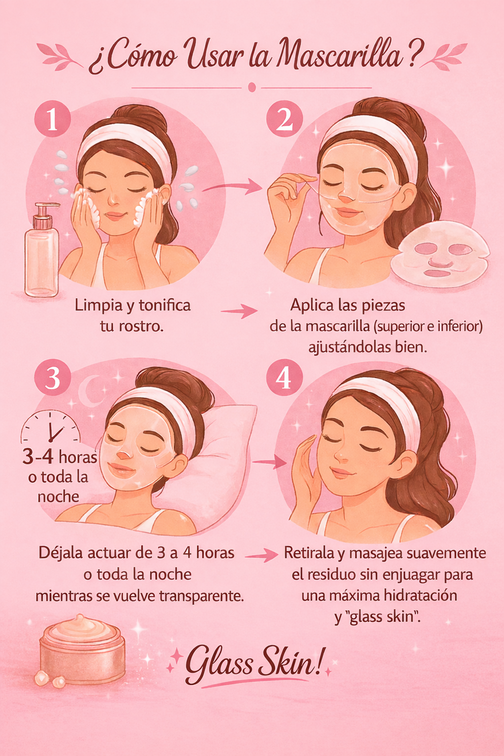 Puedes dejarla 20-30 minutos o usarla toda la noche para un efecto más intenso. Retira cuando la mascarilla se vuelva más transparente.