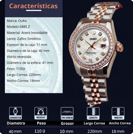 Inspirado en los relojes más exclusivos del mundo, este modelo combina robustez, elegancia y rendimiento suizo en una pieza única. Más que un accesorio, es una inversión en ti misma: cada vez que lo lleves, proyectarás confianza, éxito y sofisticación.